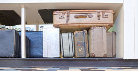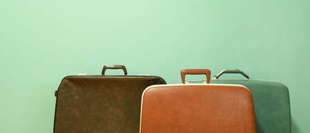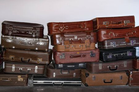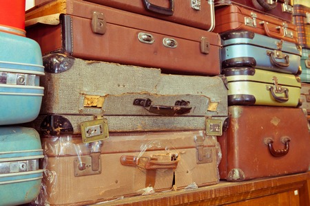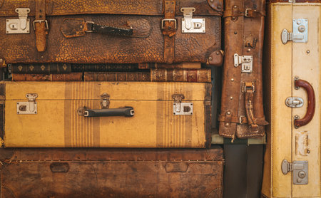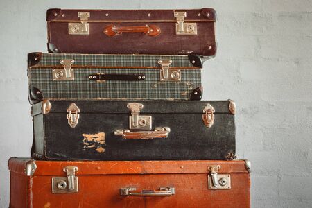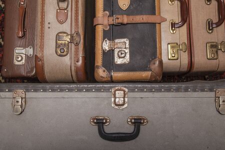 Old suitcases background. Vintage classic retro leather suitcases and travel bags. Retro style, travel concept.
