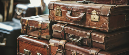 A Vintage leather suitcases stacked together, showcasing their worn charm and history. Perfect for antique lovers