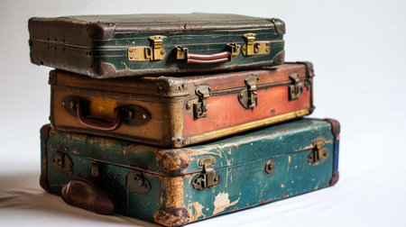Battered vintage suitcases. Three old-fashioned suitcases stacked on a white background. Wooden vintage suitcases close-up. Luggage on white background.