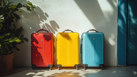 Three vibrant suitcases stand in a row against a white wall, showing their colors in a well-lit space.