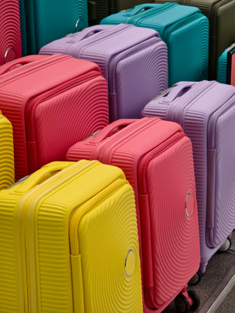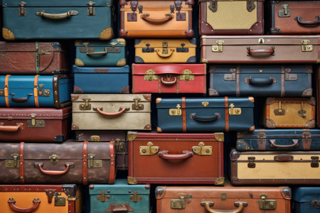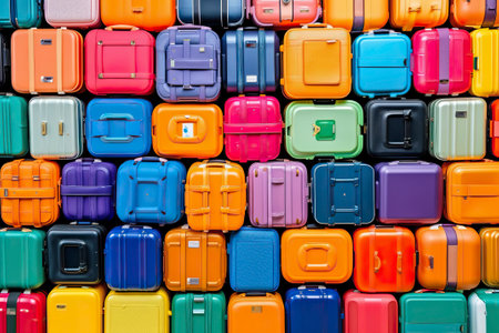 A row of colorful suitcases with various patterns and designs. Concept of travel and adventure, as the suitcases are stacked high and ready for use