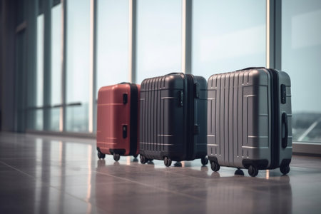 Suitcases in the airport, airport hall, airplanes in the background. Generative AI
