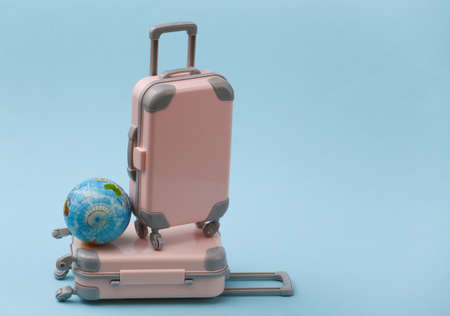 Travel, vacation or tourism concept. Two mini travel luggage suitcase with globe on a blue background