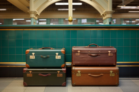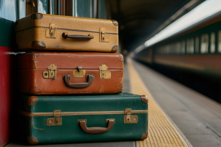 Three vintage suitcases are stacked on a train station platform, evoking a sense of travel and adventure as a train waits in the background