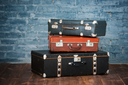 Background stack of old suitcases. Travel Concept Background longer trips. Wardrobe trunk photographer on a blue