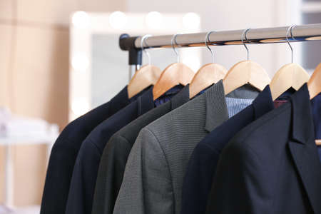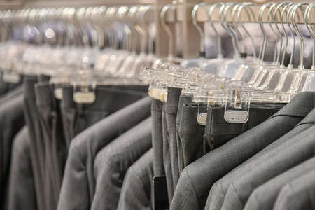 Hanger with different stylish male suits in store