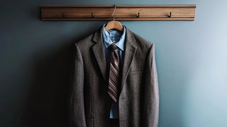 A sophisticated grey suit displayed on a wooden hanger against a serene blue wall, highlighting elegance and professionalism for fashion or business contexts.