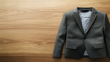 A neatly folded blazer and a pair of dress pants placed on a wooden surface with space around it for copy or branding.