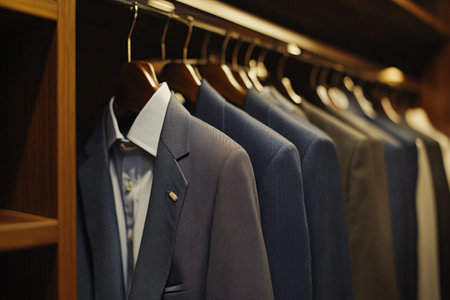 A refined display of tailored suit jackets hanging neatly in a modern closet space, showcasing the elegance and sophistication of men