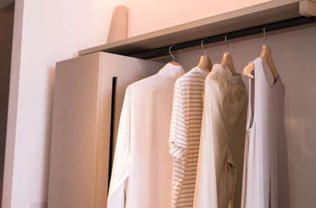 Modern walk in closets design interior with clothes hanging on rail warm tone