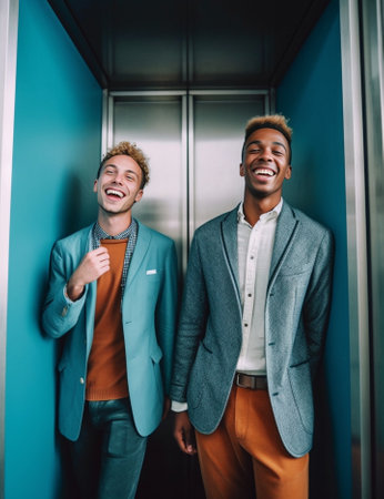 Supporting each other Side view of young modern people in smart casual wear pushing each other and smiling while moving up the stairs : Generative AI