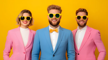 Three stylish individuals wear brightly colored suits and sunglasses, radiating happiness and vibrance.