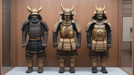 A striking display of historical Japanese samurai armor shows intricate designs and rich textures. This image captures the essence of warrior culture in a museum setting.