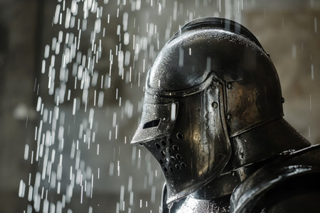 Medieval Knight in Rainy Armor CloseUp Shining Steel Helmet Under Water Droplets.