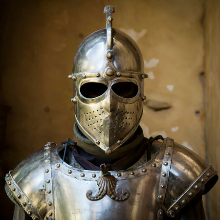 A knight's armor is adorned with gold and silver designs, including a cross. The armor is old and worn, giving it a sense of history and tradition