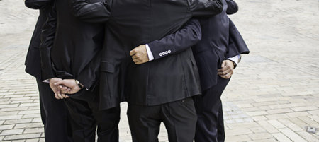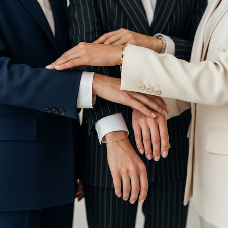 Close-up of three diverse professional women's suit sleeves and hands, symbolizing unity, corporate success, and collective female empowerment.
