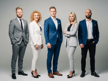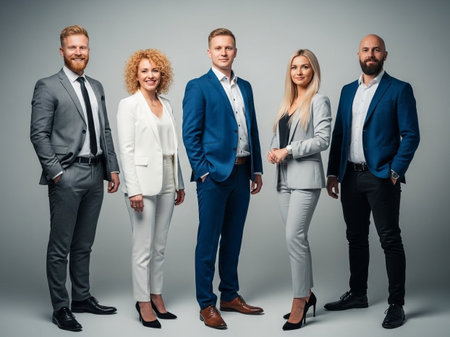 A group of five business professionals, three men and two women, dressed in formal business attire, standing in a line on a plain gray background with a subtle gradient effect