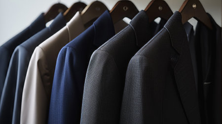 A sophisticated arrangement of tailored blazers hanging on sleek hangers, illuminated by soft natural light, perfect for fashion inspiration and styling ideas.