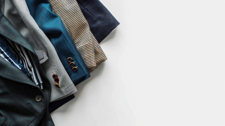 Minimalistic advertising template with a burst of chic blazers and trousers on one corner, leaving plenty of room for text on a white background, --ar 16:9 Job ID: f4fdb979-deae-46b9-9729-4762ed27614d