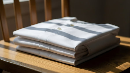 The image depicts a neatly folded stack of white sheets placed on a wooden surface. The sheets are folded into rectangular shapes and are stacked one on top of the other. The wooden surface appears to be part of a larger piece of furniture, possibly a table or bench. The lighting suggests a natural light source, casting soft shadows on the sheets.
