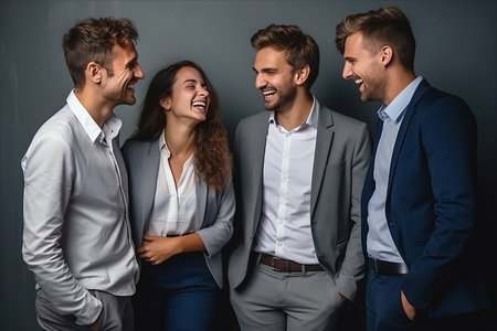 Four executives in a row, Business team standing and cheering in front of modern office, Leadership Concept, Business success win result