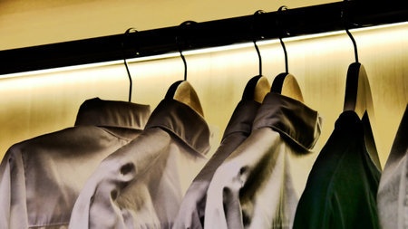 Close-up of elegant men's shirts hanging on the hangers in a wardrobe