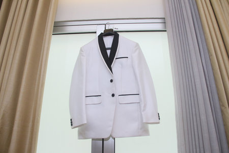 A stylish white suit jacket elegantly hangs against a neutral background, showcasing its fine tailoring and minimalist design, perfect for formal occasions.
