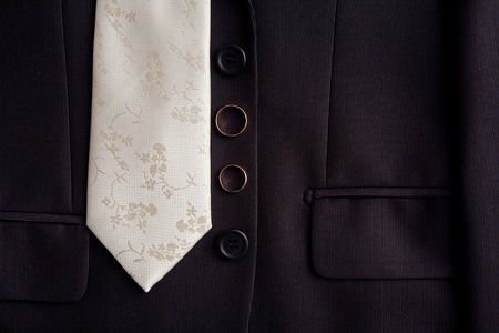 Close-up. Jacket shirt and tie are hanging on the shop window