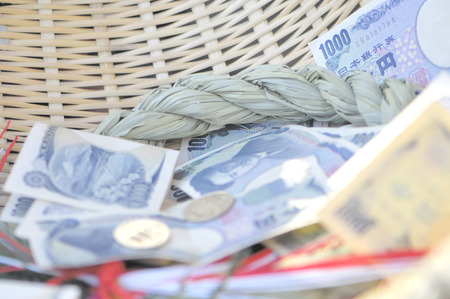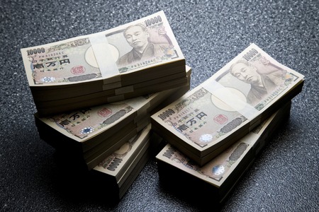 Japanese Yen Banknotes and Japanese Yen coin shot stack layers on floor. japanese currency. financial and economy money concept.