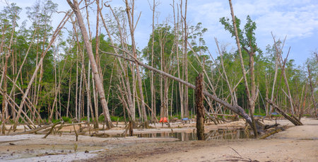 Title: This photo captures a degraded coastal wetland with many dead and fallen trees, dry sandy soil, shallow water pools, and a small boat in the background.