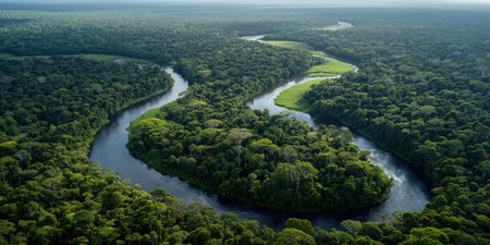 Lush green rainforest embracing a calm river from an aerial perspective, symbolizing tranquility and natures beauty.