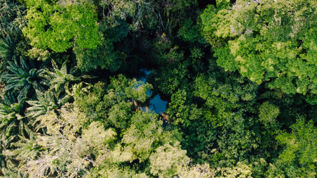 Aerial view of a dense, vibrant green forest canopy, showcasing lush tropical trees from above. Perfect for nature, environment, or conservation th...
