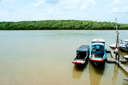 Penanti, Penang/Malaysia - Jul 01 2018: Fishing boat move at river during blue sunny day.