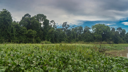 Thickets of water hyacinth on the banks of a tropical river. Lush green leaves, purple inflorescences. The trees of the rainforest in the distance. Blue sky, clouds. Malaysia.