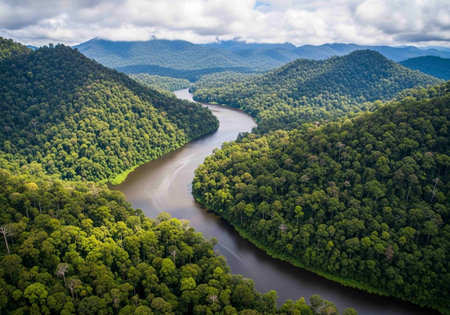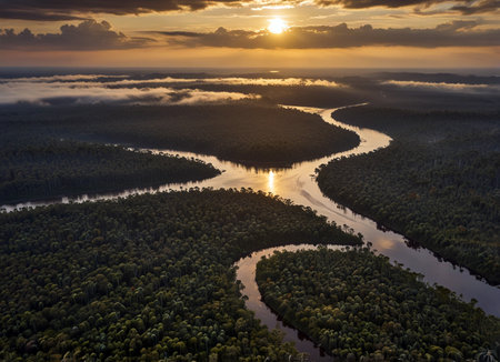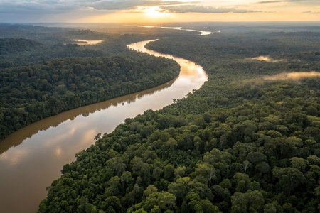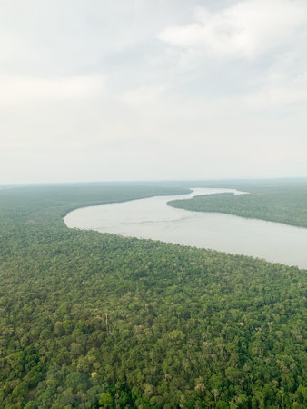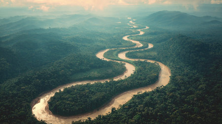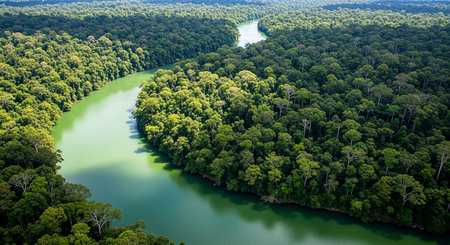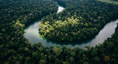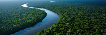 An aerial perspective reveals a wide, winding river carving through the dense, lush green canopy of the Amazon rainforest, highlighting its vast...