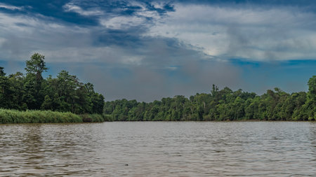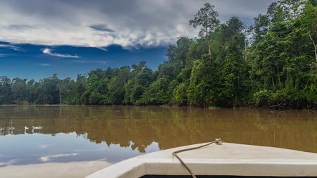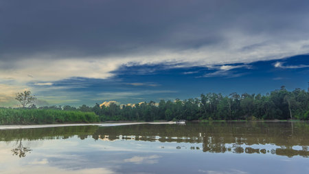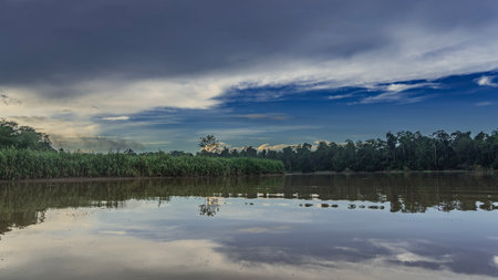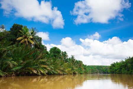A calm tropical river in the jungle. Tickets of rain forest trees on the shore. Reflection on brown water. Clouds in the sky. Malaysia. Borneo. Sandakan. Kinabatangan River.