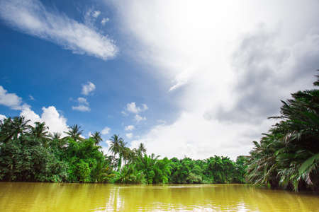 Morning in the jungle. Trees of rain forest on the banks of a tropical river. The clouds in the blue sky are highlighted in gold. Reflection on the shiny calm surface