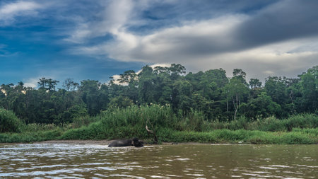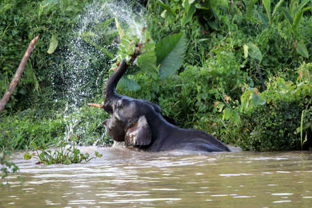A pygmy elephant walks along the riverbed. Above the water back, head. Splashes from the tip of the trunk. Tall green grass on the river bank. Rain forest trees against the sky