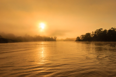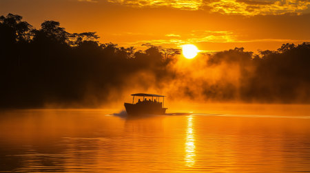 A serene boat ride at sunrise over a misty river surrounded by lush nature in the early morning hours