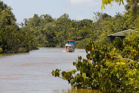 Morning in the jungle. A tourist motorboat is sailing on a calm river. Tickets of rain forest trees on the shore. Blue sky, clouds. Reflection on the smooth shiny surface