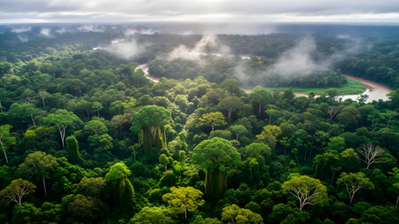 A spectacular aerial view of a lush tropical rainforest with a winding river carving through the dense canopy. Patches of mist and low clouds hover over the endless sea of green trees, highlighting the humid ecosystem.