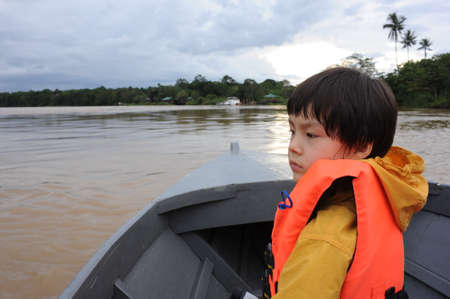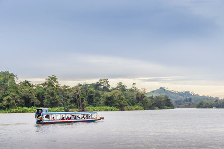 Kinabatangan, Malaysia - 09 May 2013: Tourists on a boat cruise along the river of Kinabatangan, some of the most diverse concentration of wildlife in Borneo.
