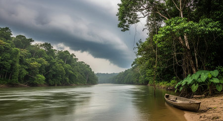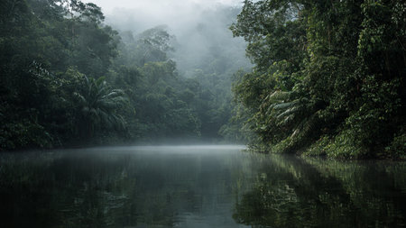 AI Generated. Pristine river reflecting dense greenery in a tranquil jungle landscape during the early morning hours