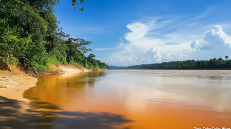 A tropical river in the jungle. Ripples on the shiny water. Green trees of the rain forest on the shore. Blue sky, clouds.