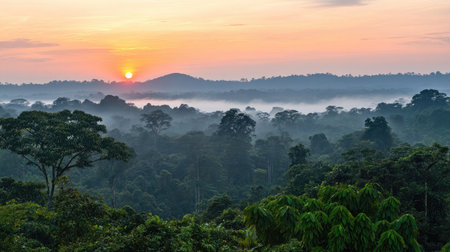 A meandering river cuts through the dense and verdant foliage of a vibrant jungle in a remote location, A river trailing through rainforest terrain at dawn, AI Generated