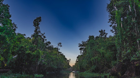 Morning in the rainforest. A calm river and thickets of trees on the banks. Tourist boats in the distance, in the riverbed. The blue sky is highlighted with orange at the horizon.