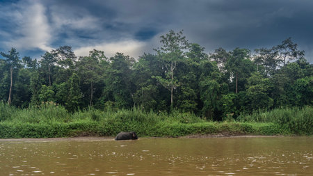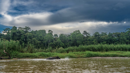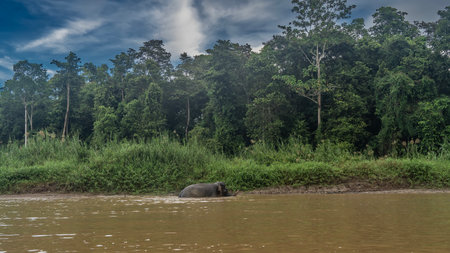 A Borneo pygmy elephant, endemic roams the river. Above the water, the back, the head. On the shore there are thickets of lush green vegetation of the rainforest. Malaysia.