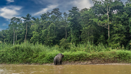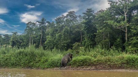 The pygmy elephant comes out of the river onto the clay shore. View from the back. Red-brown water. Tickets of tall green grass. Rain forest trees against a blue sky and clouds.