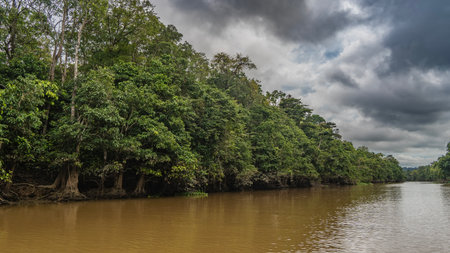 A tropical river in the jungle. Brown water. There are impenetrable thickets of rain forest trees on the shore. Clouds in the sky. Malaysia. Borneo. Sandakan. Kinabatangan River