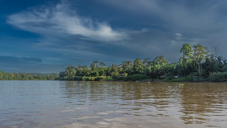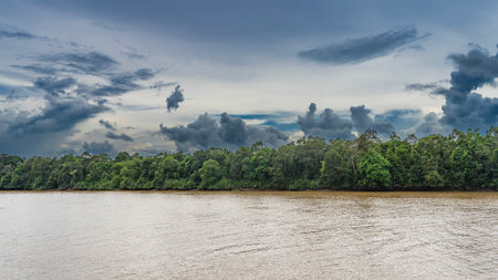 A tropical river in the jungle. Ripples on the surface of the brown water. Tickets of rain forest trees on the shore. Picturesque clouds in the sky. Malaysia. Borneo.